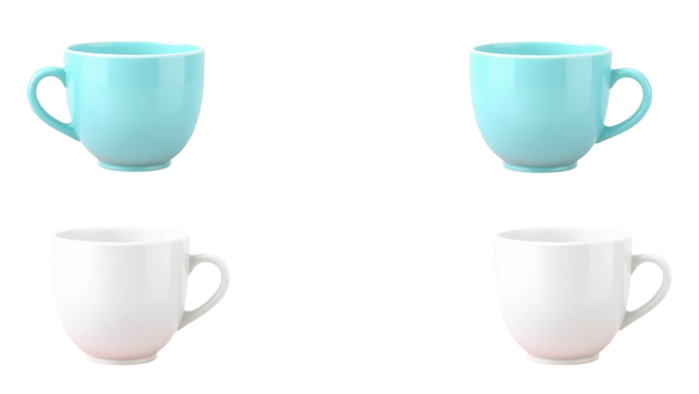Vier elegante, schlichte Tassen, isoliert auf transparentem Hintergrund. Das Set beinhaltet zwei türkisfarbene und zwei weiße Keramiktassen