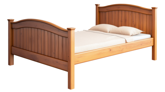 Isolated Wooden Bed Frame Furniture with White Bedding on Transparent