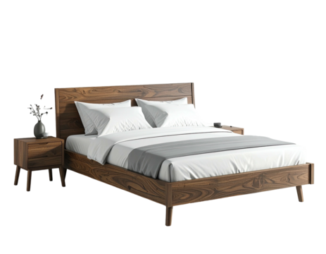 Modern wooden bed with clean white linens and pillows against a transparent background, providing comfort and relaxation in a contemporary bedroom furniture setting