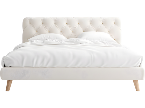 Isolated view of a beige upholstered bed with pillows and duvet ready for sleeping