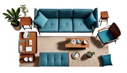 Luxurious puffy sectional with natural wood finish isolated on transparent background