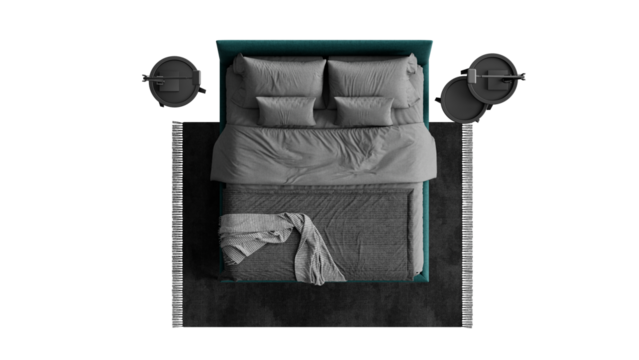 Birds-eye view of old carved bed frame headboard, detached, isolated on a Transparent background, PNG file.