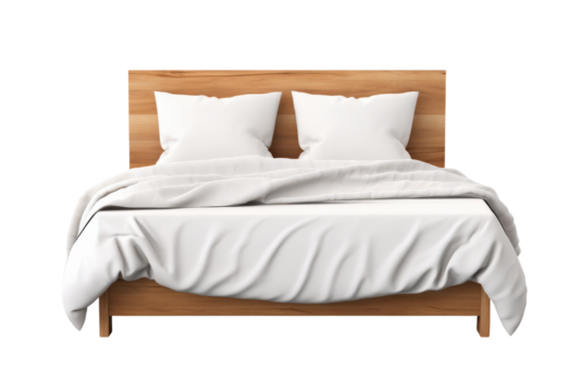 Front view of a wood bed with white sheets isolated on transparent background Png