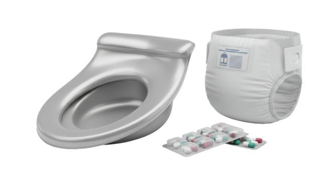 Silver Bedpan with Disposable Diaper and Blister Pack of Pills in a Clean Composition Featuring Healthcare and Personal Hygiene on White Background
