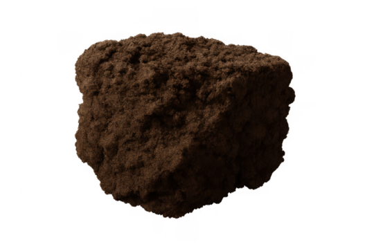 Pile of dark brown granular soil or compost on a transparent background for gardening and agriculture concepts