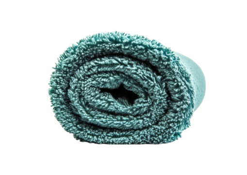Teal cotton towel loosely rolled with folded edge and soft texture Isolated on a transparent background