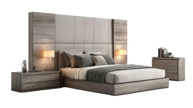 Stylish modern bedroom set featuring a comfortable bed, elegant lamps, and bedside tables with a sleek design.