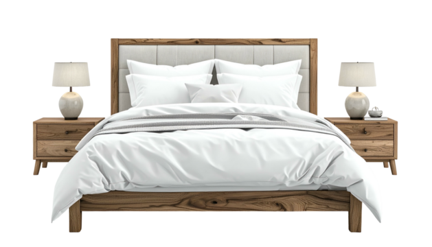 Wooden bed with white linens and bedside tables
