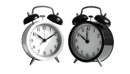 Two vintage alarm clocks, one white, one black, each showing a different time, isolated