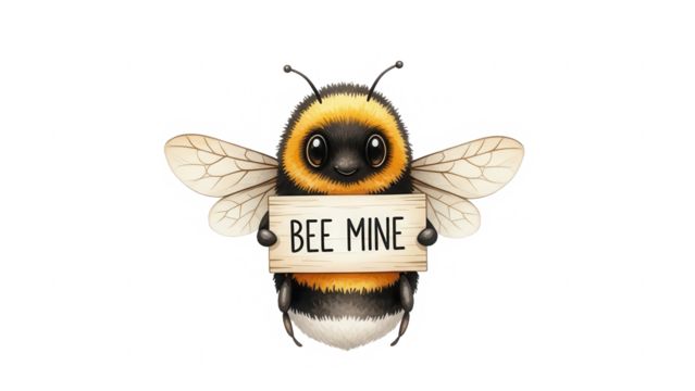 Cute fluffy bumblebee holding a "bee mine" sign for valentine's day or a sweet message isolated on transparent background