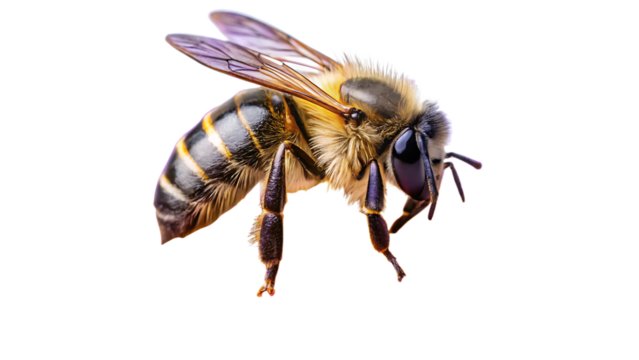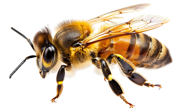 a stunning bee is flying, isolated on transparent background, macro, generative AI