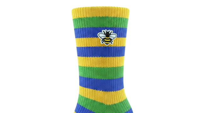 An artistic depiction of a vivid, polka-dotted bee with yellow and black coloration. The insect is captured in detailed resolution against a white isolated background.
