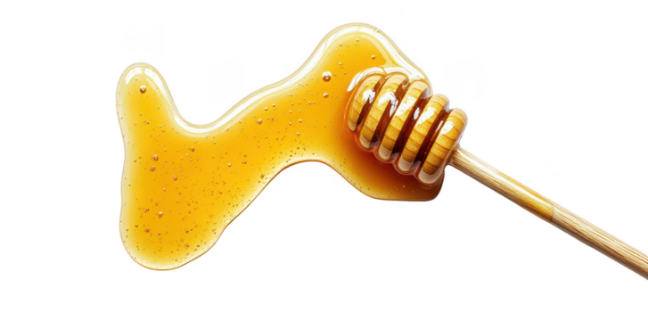 A close-up view of a wooden honey dipper dripping golden honey onto a smooth white surface. highlighting the texture and richness of the honey. suitable for culinary and health-related themes