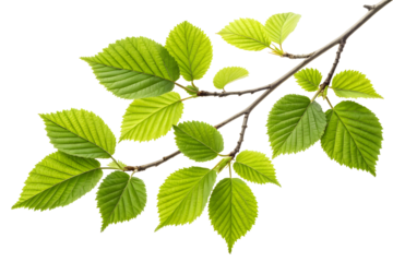 A branch of a twig tree with vibrant green leaves isolated on white or transparent background