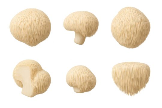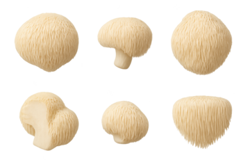 Six beige mushrooms with fibrous textured caps shown from multiple angles in clean white layout