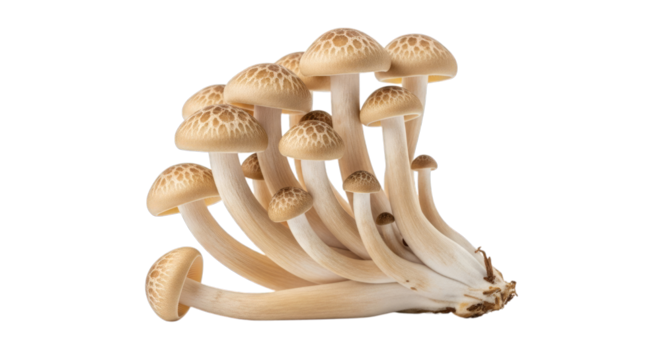A cluster of beech mushrooms with patterned caps on a plain setting on transparent background