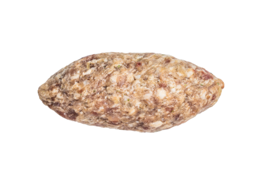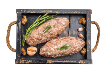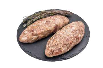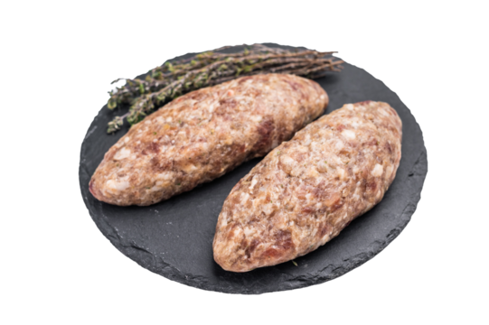 Freshly prepared raw Kofta kebab, marinated with spices, ready for grilling and bursting with flavor. isolated on white background. top view