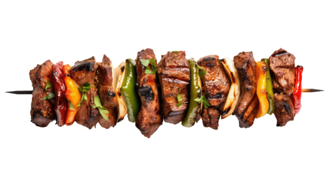 One little kebab on a wooden stick with meat and vegetables. Shish kebab on skewer isolated on white transparent png background, cutout.