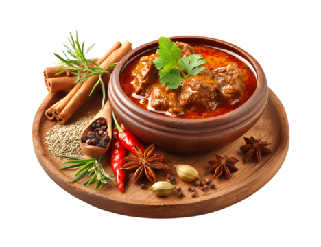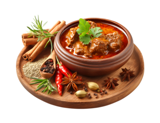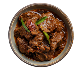 Slow-cooked beef rendang with coconut milk and spices with red chilies and garnish isolated on a transparent background