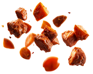 Spicy Indonesian beef rendang chunks with flying chili slices and sauce splash isolated on transparent background