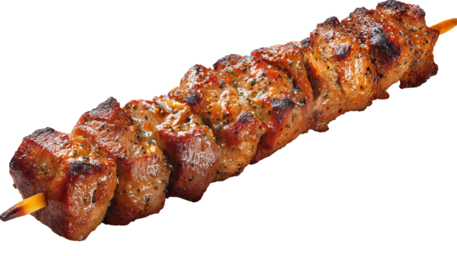 Grilled meat kebab skewer isolated on transparent background — high-resolution PNG cutout of juicy barbecue shish kebab with char marks, realistic food clipart for menu design, packaging, restaurant