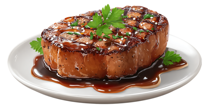 A delicious beef steak with sauce and herbs on a white plate isolated on transparent background