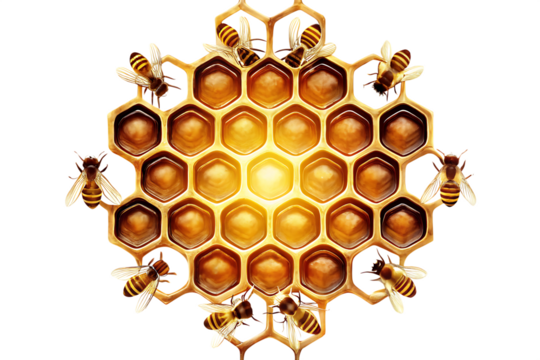 Close up of a beehive entrance filled with bees and honey on a transparent background isolated on transparent background
