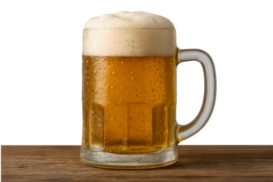 Cold beer mug with foam on wooden table isolated on white background for Oktoberfest or beer ads