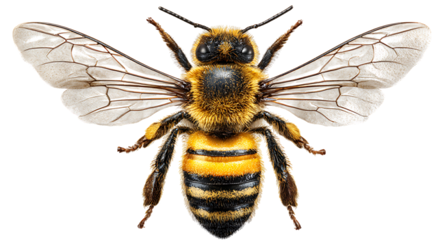 Honey bee insect macro close-up detailed wings striped black yellow fuzzy body. Pollination nature wildlife flying bug. Apis mellifera ecology environment isolated transparent background