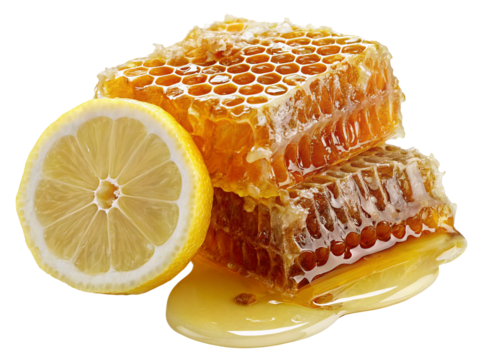 Lemon slice next to dripping honeycomb showcasing fresh sweet and tangy natural ingredients
