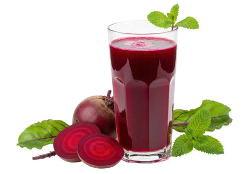 Fresh beetroot juice in glass isolated PNG, healthy drink with mint leaves and beet slices on transparent background