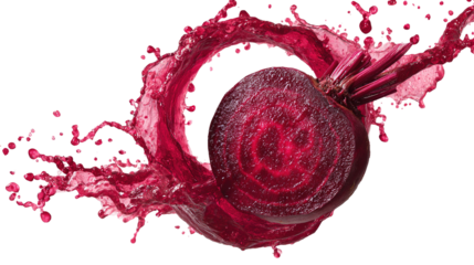 Vibrant beetroot splashing into a pool of fresh red juice on a black background isolated on transparent background