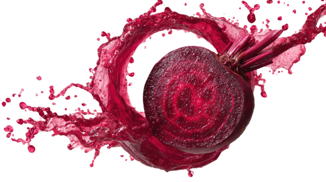 Whole beetroot splashing in a dynamic burst of vibrant red liquid juice.isolated,