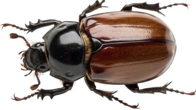 Shiny brown beetle PNG isolated on transparent background, scarab beetle with black head and legs, insect specimen for entomology and science