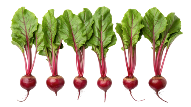 A row of beets with leafy tops and vibrant red stems, isolated on transparent background