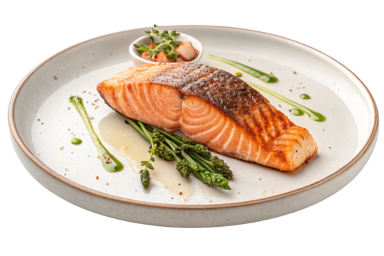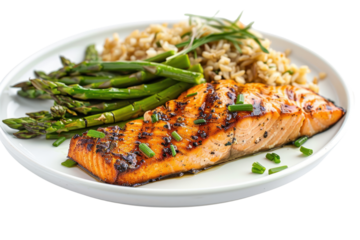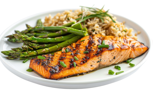 A tempting dinner plate filled with grilled salmon, roasted asparagus, and brown rice, isolated on a white background.