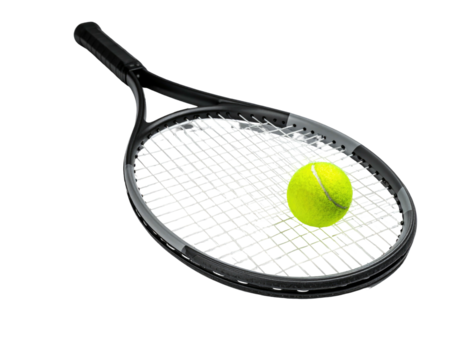 A black tennis racquet with a yellow ball resting on its strings, on black background