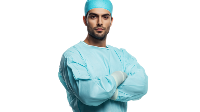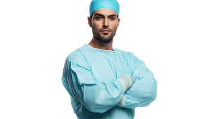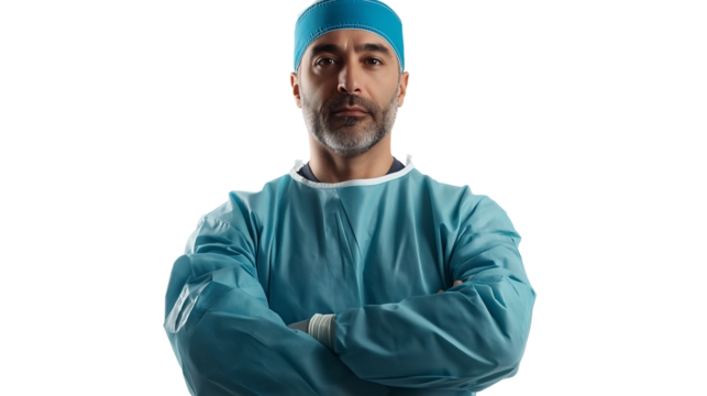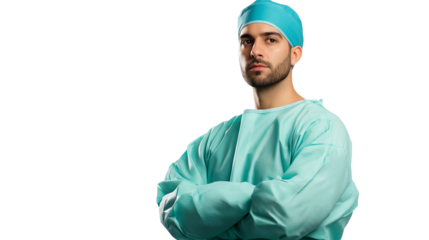 Surgeon in a surgical gown, confident and focused gaze, ready for work, isolated on a white background