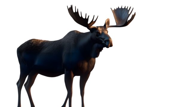 A magnificent moose with sprawling antlers, occupying 75 percent of the frame with a calm and stately demeanor on a transparent background