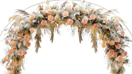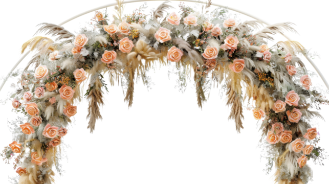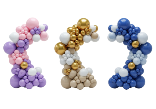 Three luxurious balloon arch garlands, pastel and metallic gold chrome balloons, floating against a high-key transparent studio background with copy space. Concept for sophisticated event