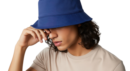 Young Man Wearing Navy Blue Cotton Bucket Hat and Beige T-shirt on White Background