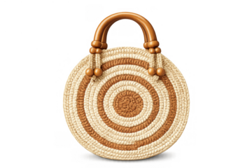 Round straw handbag with woven concentric pattern and wooden handles, bohemian beach accessory on transparent background