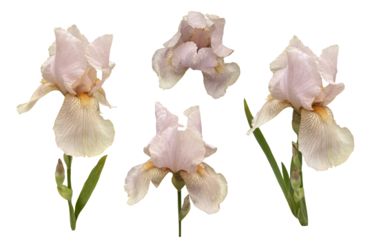 Iris germanica set tender light pink beige garden flower with bud and stem selective focus close-up, cutout with clipping path object, floral design element, clipart for card, invitation decor