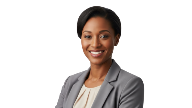 Smiling businesswoman wearing gray blazer looking forward on white background with friendly expression and short black hair