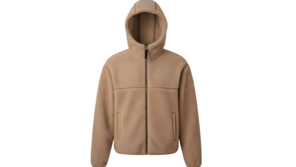 Brown hooded jacket with zipper closure and embroidered design on front isolated on transparent background