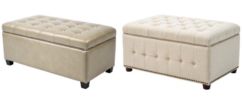 Elegant beige upholstered ottoman with turned wooden legs on transparent background