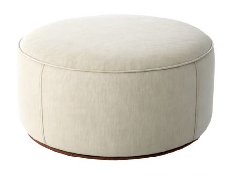 A simple, round, beige pouf or ottoman provides a minimalist seating option, isolated on transparent background
