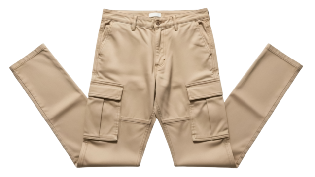 Isolated pair of beige cargo pants, utilitarian apparel for men, stylish and practical