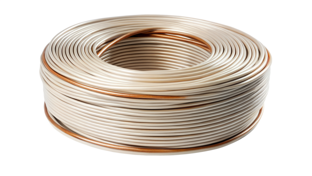 A coil of beige electrical cable with copper wire, isolated on transparent background