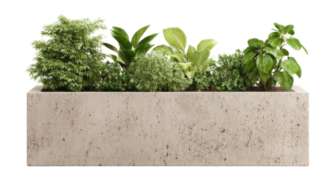 Light beige rectangular planter filled with various greenery